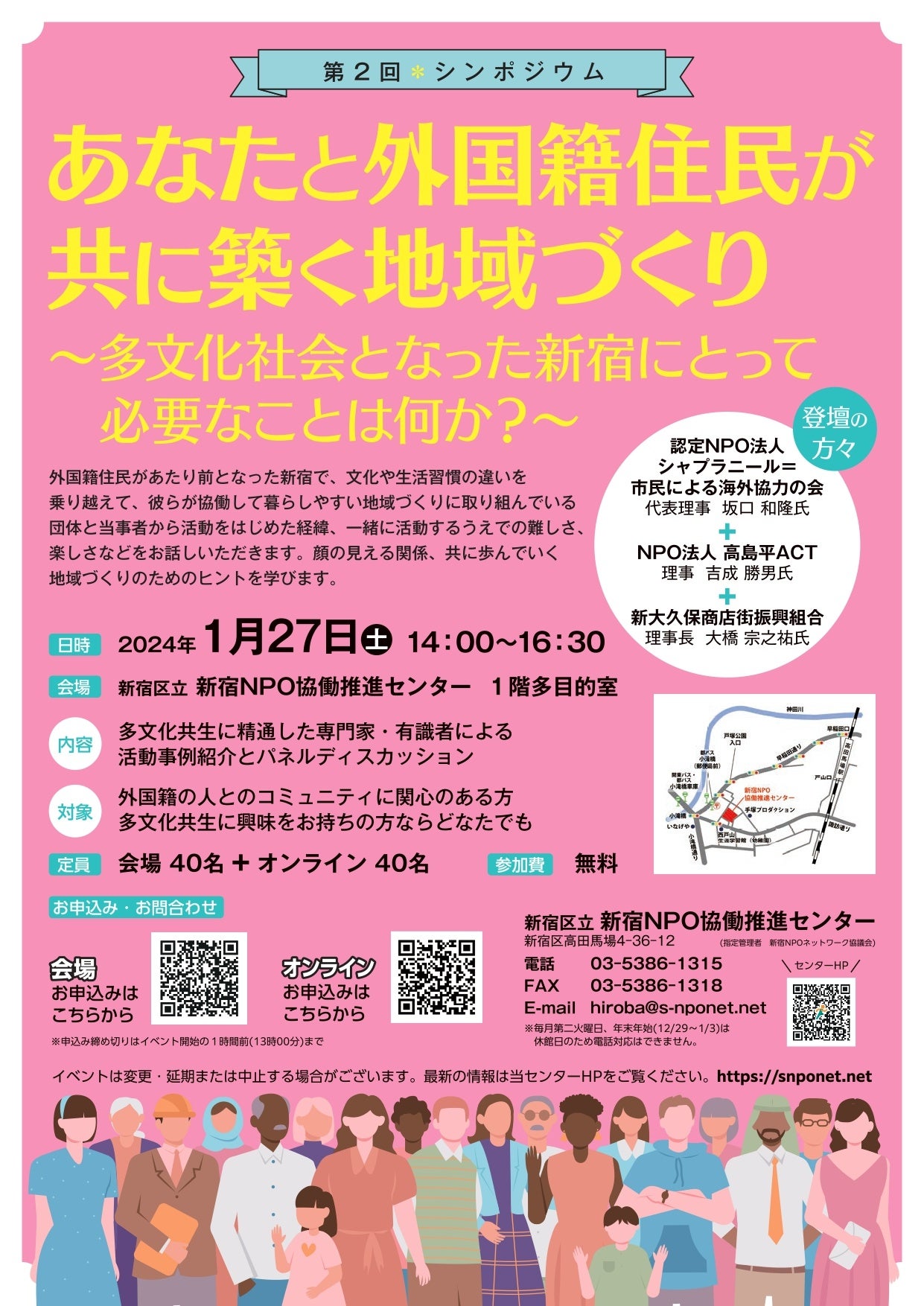 今回のシンポジウムでは外国籍住民があたり前となった新宿で、文化や生活習慣の違いを乗り越えて、協働して暮らしやすい地域づくりに取り組んでいる団体と当事者から活動をはじめた経緯、一緒に活動する上での難しさ、楽しさなどをお話しいただき、顔の見える関係、共に歩んでいく地域づくりの為のヒントを学びます。