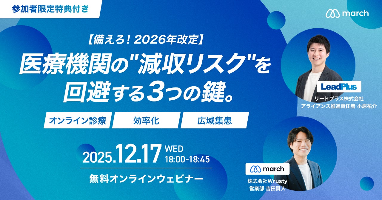 LINEを活用した集患と継続収益まで自動化するオールインワン医療DX「march」を展開する株式会社Wrusty(本社:東京都渋谷区、代表取締役:上田 遼)と、マーケティング・広告運用など幅広くサポートしているリードプラス株式会社(本社:東京都世田谷区、代表取締役:堀 裕)が、全国の医療機関を対象に、無料オンラインセミナー『【備えろ!2026年改定】 "減収リスク"を回避する3つの鍵。「オンライン診療」「効率化」「広域集患」』を2025年12月17日に開催いたします。本セミナーでは、2026年の診療報酬改定において、診療所報酬の適正化(大幅な減収リスク)や医療DXへの対応義務化など、クリニック経営の根幹を揺るがす大きな変化に備え、経営危機を乗り越え、安定的な増収を実現する戦略を具体的に解説します。また、収益の「分母」を拡大するための「オンライン診療」と、その最大の課題である「集患」をWeb広告で解決する実践ノウハウですが詰まった内容となっております。