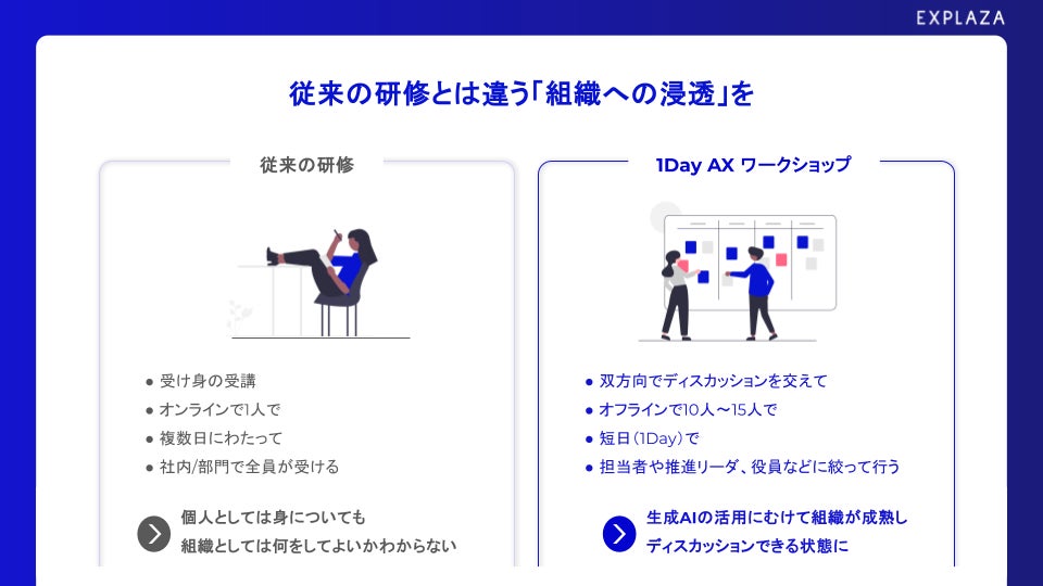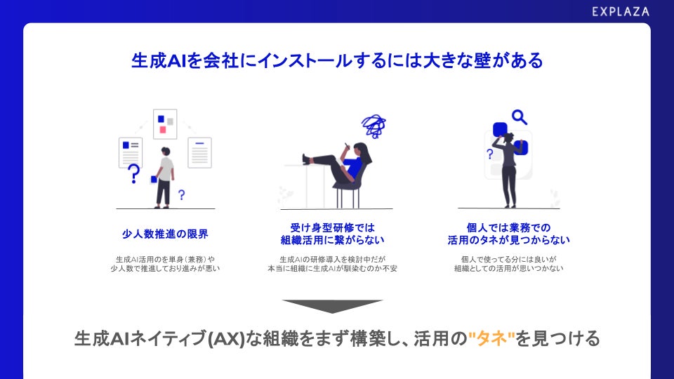 生成AI活用のコンサルティングから開発までを一気通貫で支援する株式会社エクスプラザ(本社:東京都港区、代表取締役:高橋 一生、以下「当社」)は、生成AIネイティブな組織構築を支援するパッケージ『ハタアゲAX(AI Transformation)』(以下ハタアゲAX)の提供を開始しました。