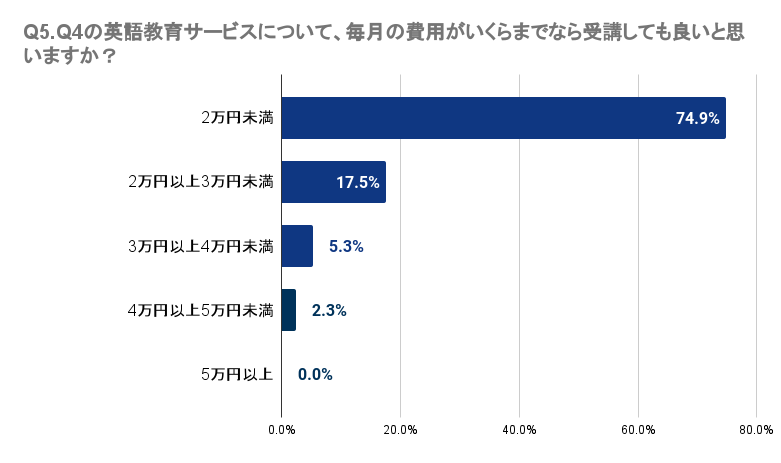 Q4で「受講したい」「料金が安ければ受講したい」「興味がある」と回答した人に、Q5で、「Q4の英語教育サービスについて、毎月の費用がいくらまでなら受講しても良いと思いますか?」と質問したところ、最も多い74.9%の回答者は2万円未満が適切と感じています。17.5%は2万円以上3万円未満、5.3%は3万円以上4万円未満と答えました。対照的に、4万円以上の費用を考える回答者は極少数で、4万円以上5万円未満が2.3%、5万円以上が0.0%でした。これにより、愛知県では多くの人が3万円未満の価格帯を望んでいることが明らかとなりました。