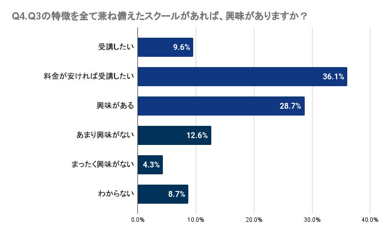 Q4で「Q3の特徴を全て兼ね備えたスクールがあれば、興味がありますか?」と質問したところ、愛知県では9.6%が受講を希望し、36.1%は料金が手頃であれば受講したいと考えています。さらに、28.7%は興味を示していると回答しました。多くの人がこのような特徴を持つスクールに一定の興味を示していることが分かります。