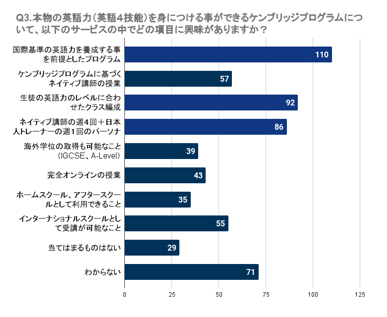 Q3で「本物の英語力(英語4技能)を身につける事ができるケンブリッジプログラムについて、以下のサービスの中でどの項目に興味がありますか?(複数回答可)」と質問したところ、愛知県で最も多かったのは「国際基準の英語力を養成する事を前提としたプログラム」で110名でした。次いで、「生徒の英語力のレベルに合わせたクラス編成」には92名、「ネイティブ講師の週4回+日本人トレーナーの週1回のパーソナルトレーニング」には86名が興味を持っています。一方で、「海外学位の取得も可能なこと(IGCSE、A-Level)」や「ホームスクール、アフタースクールとして利用できること」に関心を持つ人はやや少なめで、それぞれ39名、35名の回答でした。これらの結果から、多くの人は実用的な英語力の養成や個別のニーズに応じた指導に重きを置いていることが伺えます。
