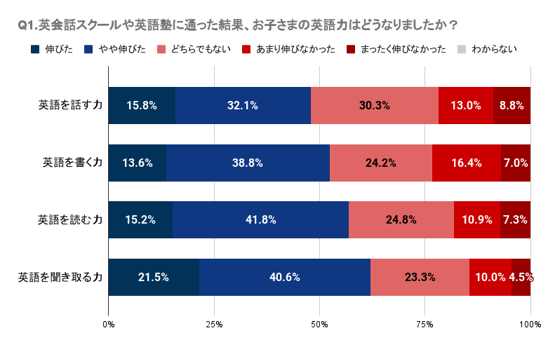 Q1で「英会話スクール、英語塾に通った結果、お子さまの英語力はどうなりましたか?」と質問したところ、愛知県では英会話スクールや塾に通って英語のスキル向上を明確に感じられなかったと感じている人が一定数いることが分かりました。具体的には、英語を話す、書く、読む、聞き取る各スキルにおいて、「伸びた」と感じる人は13.6%~21.5%であり、一方で「あまり伸びなかった」や「まったく伸びなかった」と回答した人が合わせて14.5%~23.3%となっています。特に、「英語を話す力」と「英語を書く力」においては「あまり伸びなかった」と「まったく伸びなかった」の合計がそれぞれ21.8%、23.3%となっています。また、各スキルに関して「どちらでもない」と答えた人も含めると、37.9%~52.1%となっており、明確な効果を実感していない人が一定数存在することが伺えます。