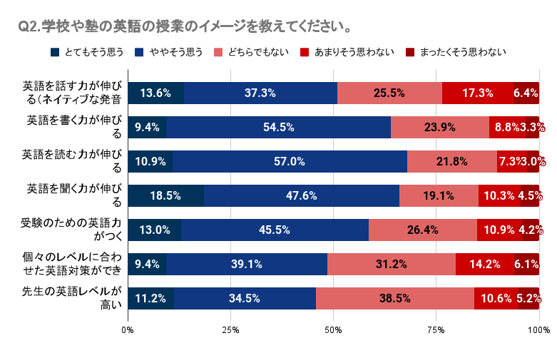 Q1・Q2では、子どもが英会話スクールや英語塾に通っていたが英語力アップの効果を感じていない人が一定数いること、学校や塾の英語の授業に対して明確な効果や良い印象を持てていない人が多いことが明らかになりました。