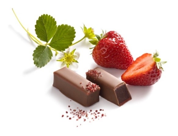 内容:金ゴマ入りのゴマのプラリネをミルクチョコレートでコーティングし、イチゴ風味のチョコレートプレートを重ねたブシェ。