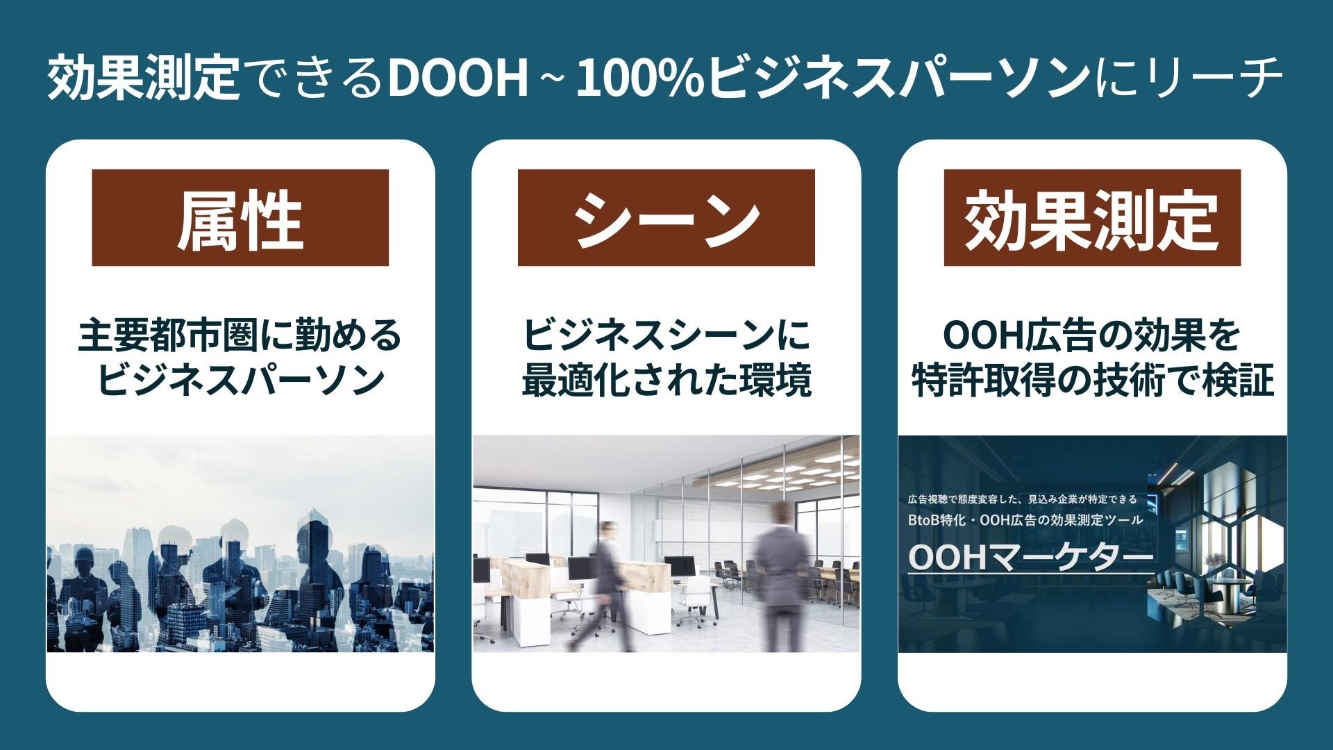 「あたらしい、あたりまえをつくる」をミッションに掲げるスタートアップ企業です。効果測定できるDOOH・オフィス内サイネージメディア『Office Visiont』と、DOOH広告の効果測定ツール『OOHマーケター』の展開を行なっています。