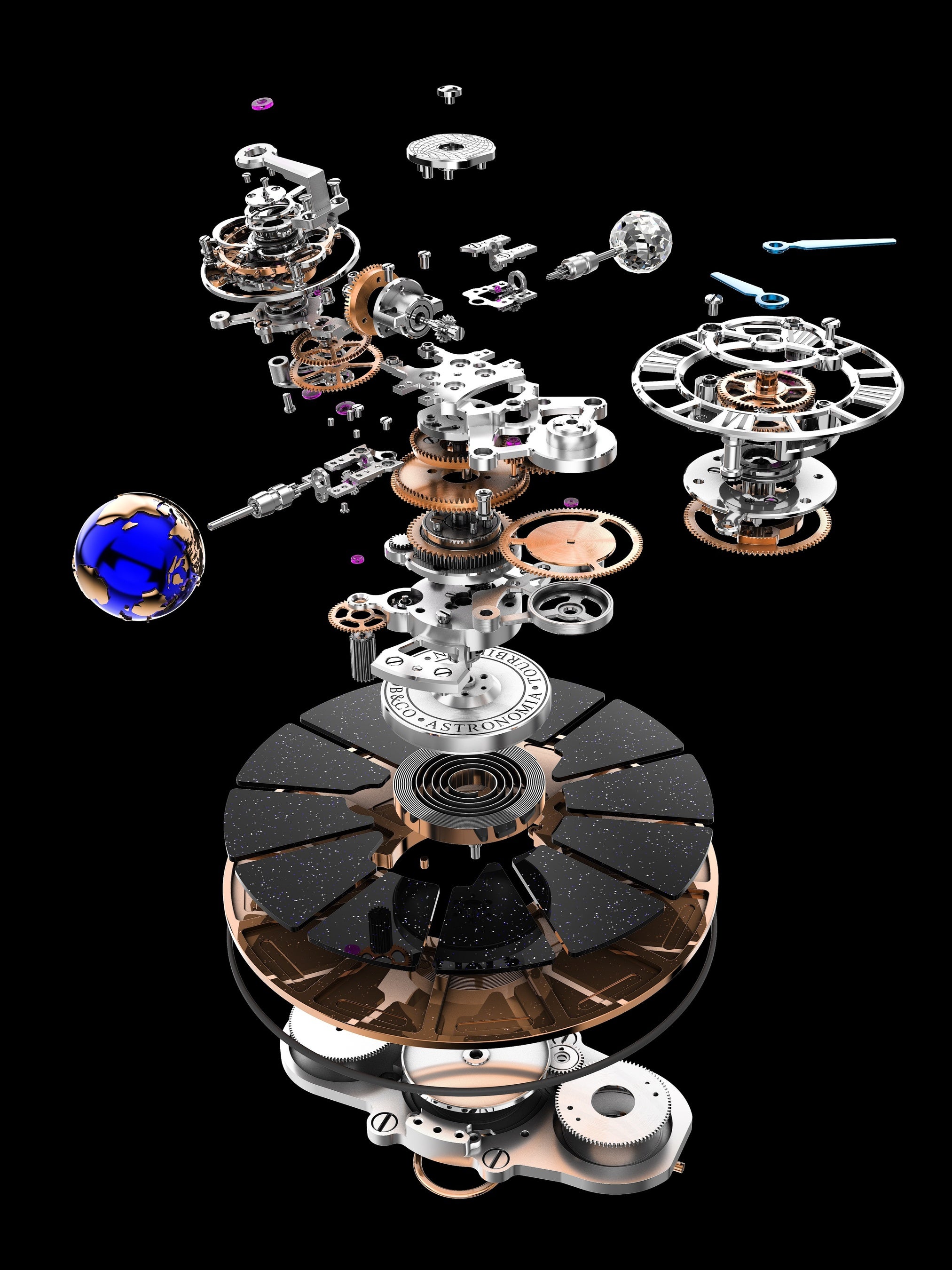 最大の特徴は、ムーブメント全体が20分で1回転し、その上で4つの構成要素がそれぞれ自転・公転するという、かつてない立体的な構造でした。(①フライングトゥールビヨン ②ディファレンシャル機構搭載の文字盤 ③ラッカー仕上げの地球儀(マグネシウム製) ④ジェイコブカット(288面のカッティング。特許取得済み。)を施したダイヤモンド)