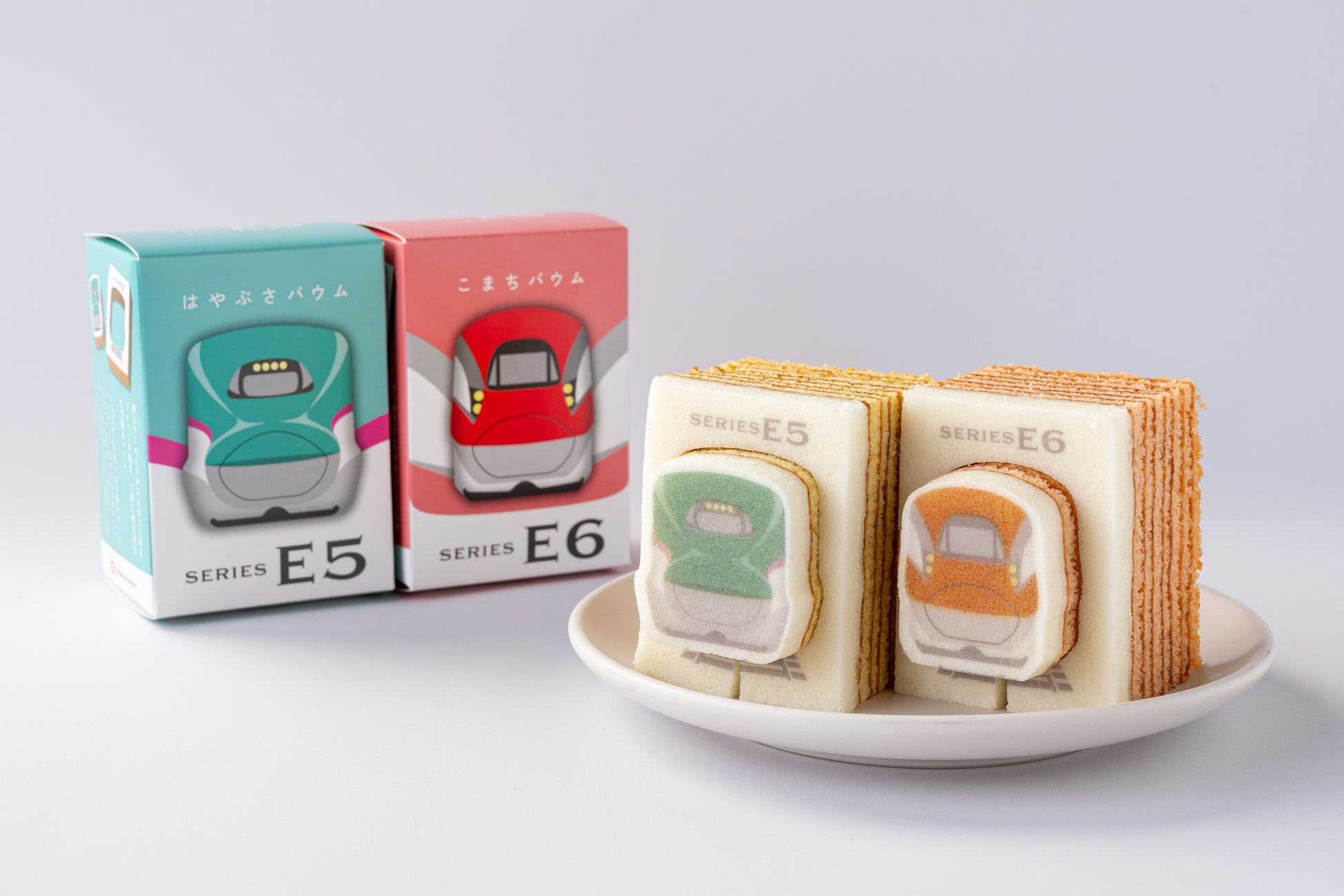 丁寧に焼き重ねられた平焼きのバウムクーヘンに、大人気の新幹線、E5系はやぶさとE6系こまちのプリントとカットを施しました。はやぶさは卵とアーモンドがほのかに香るプレーン生地、こまちはすっきりとした甘さのいちご味で、お子さまから大人まで楽しめるフレーバーです。