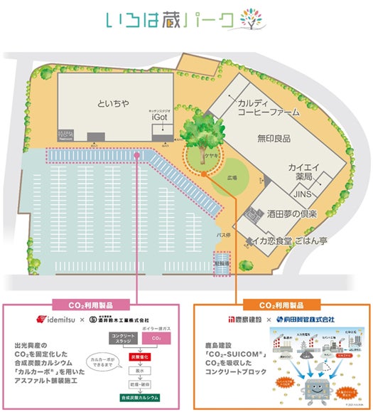 いろは蔵パーク株式会社(代表取締役:髙橋 剛)、鹿島建設株式会社(代表取締役社長:天野 裕正、以下「鹿島」)、出光興産株式会社(代表取締役社長:木藤 俊一、以下「出光興産」)、前田製管株式会社(代表取締役社長:前田 直之、以下「前田製管」)、酒井鈴木工業株式会社(代表取締役社長:鈴木 啓一郎、以下「酒井鈴木工業」)、一般社団法人カーボンリサイクルファンド(会長:満岡 次郎)の6者は、このたび新たに山形県酒田市に開業する商業施設「いろは蔵パーク」において、カーボンリサイクルの社会実装を目的として、下記製品・技術を導入しました。