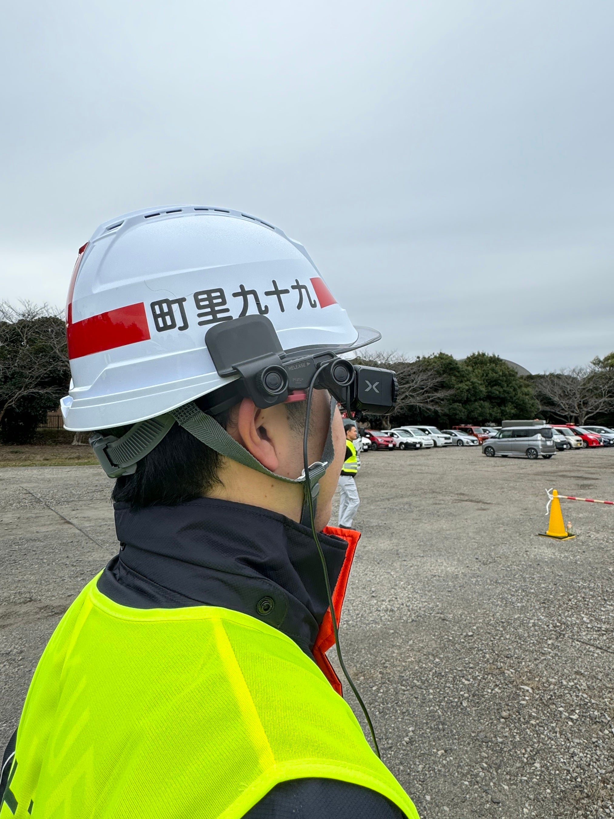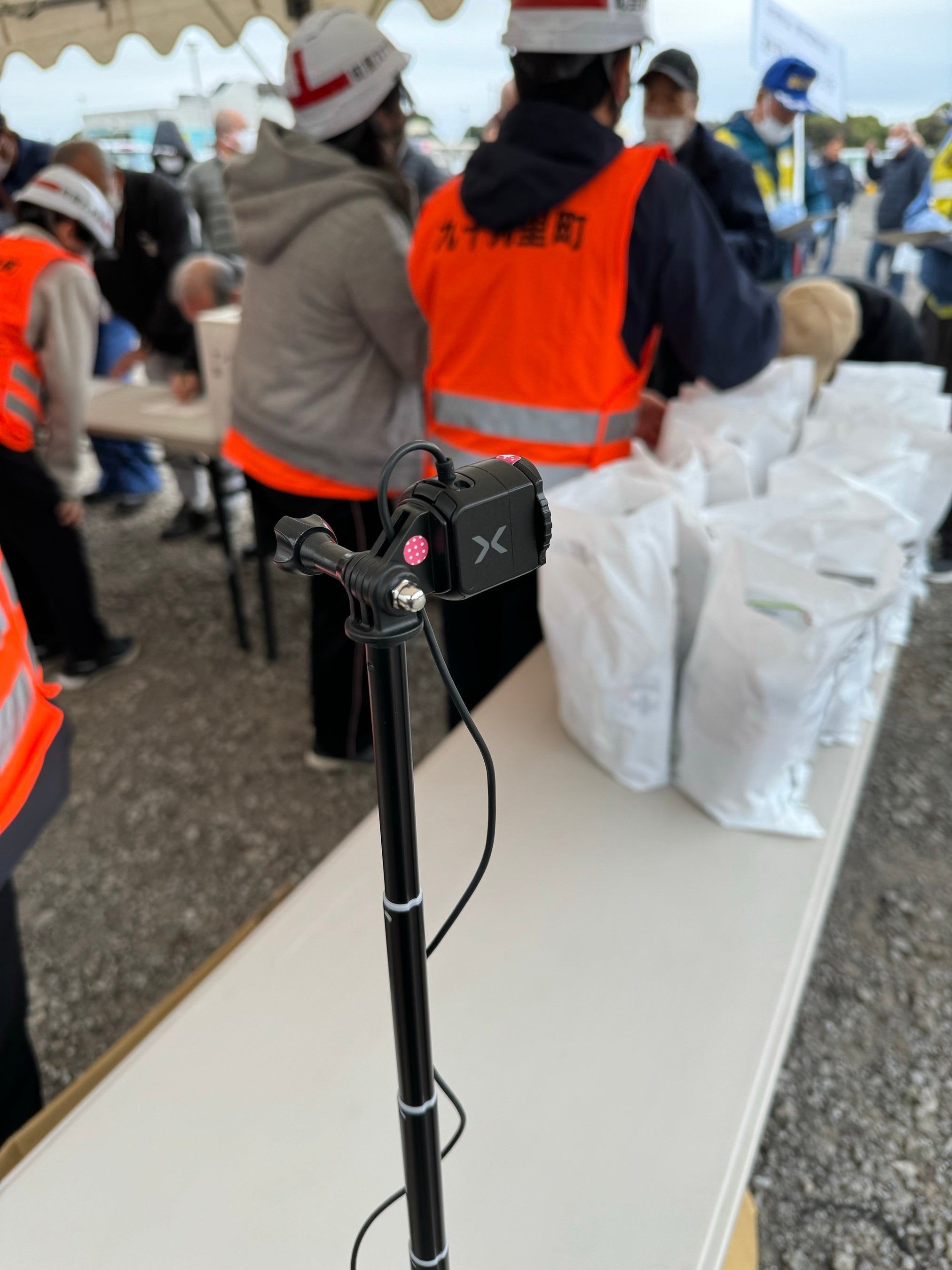 Xacti LIVEは本訓練のうち、「九十九里町住民による津波避難訓練」で活用され、Xacti LIVEの映像デバイス(以下、CX-WL100)は避難場所として指定された「東金市浄化センター駐車場」の受付に固定設置されたほか、誘導員のヘルメットに装着され、九十九里町住民の広域避難先となる東金市の災害対策本部へ現場の様子を映像配信いたしました。また、実際にCX-WL100を装着した誘導員の方からは「大変軽く、装着しても(装着していることが)気になることはない」とのコメントをいただきました。