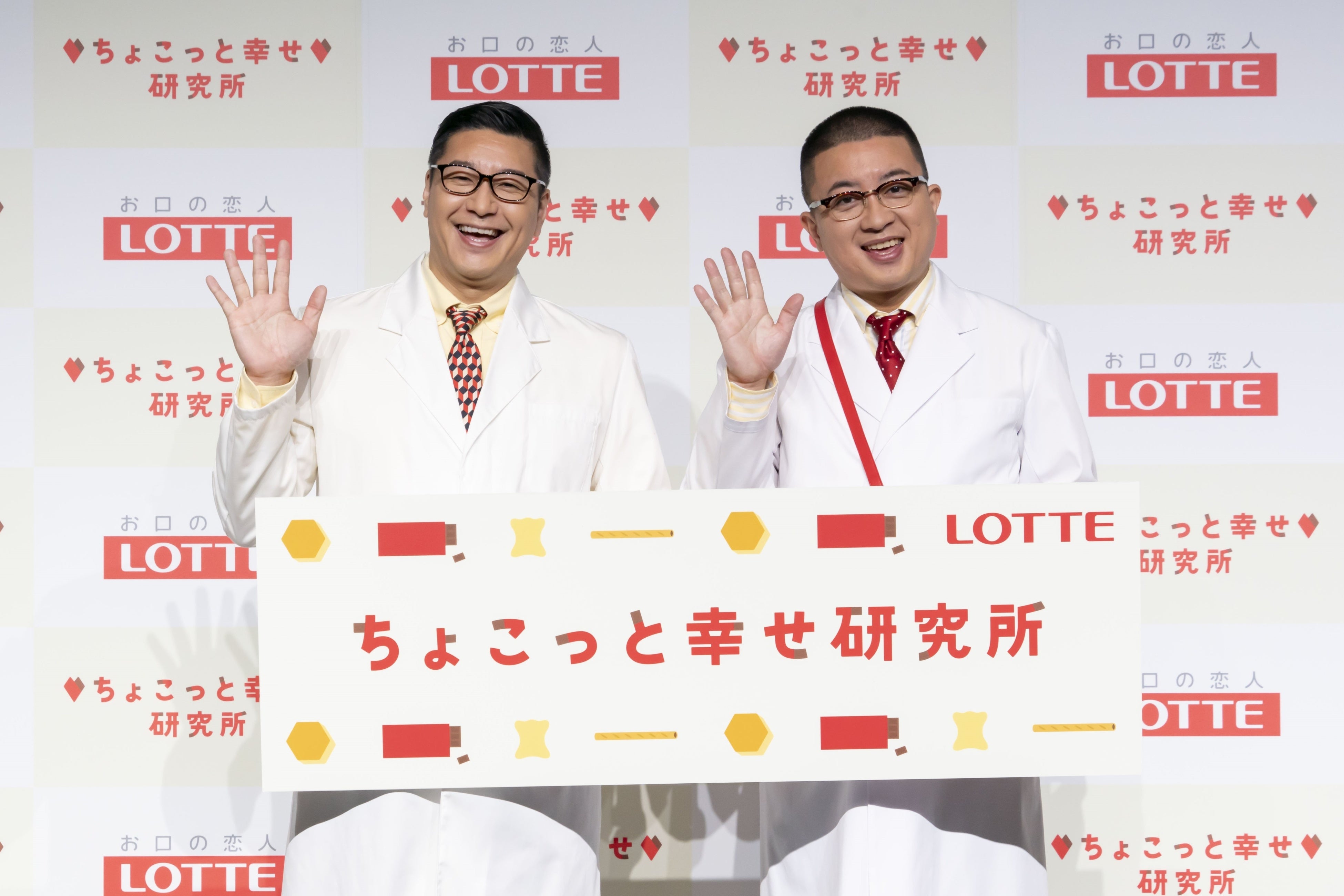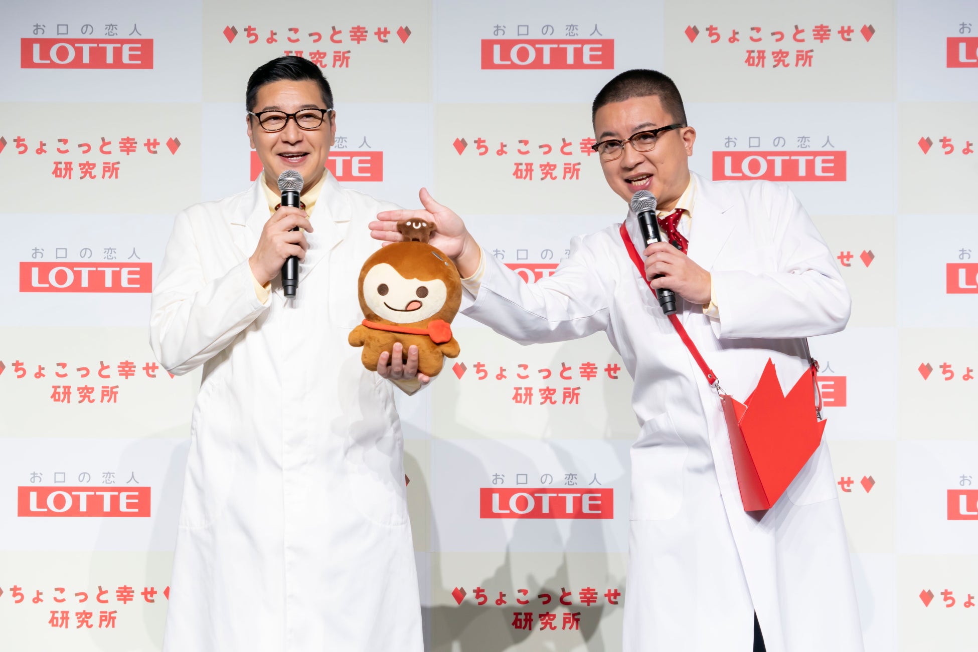 「“ちょこっと”登壇してきました」と研究員姿で登場したチョコレートプラネットのお二人。衣装を見て「“ちょこっと”似合ってますね」と盛り上がる様子も。松尾さんは、研究所の公式キャラクターであるミルクチョコレートの妖精「ぐうちょこ」と同じようにチョコレートの入った赤いハートのポシェットを身に着け、司会や報道関係者にチョコレートを手渡し。会場後方のムービーカメラマンにも「ちゃんと撮ってね」とチョコレートをアピールし、ちょこっと幸せをお届け。その姿に会場も和み、まるでチョコレートをシェアすることで幸福度が高まる可能性があるとの調査結果を体現していました。コンビ名の由来を聞かれた二人は、「ロッテのチョコレートが由来しているといっても過言ではないのでイベントに登壇できて嬉しい」とおどけてコメント。さらに、松尾さんが「初めてちゃんともらったバレンタインチョコはガーナで、今でも覚えている」とエピソードを披露しました。