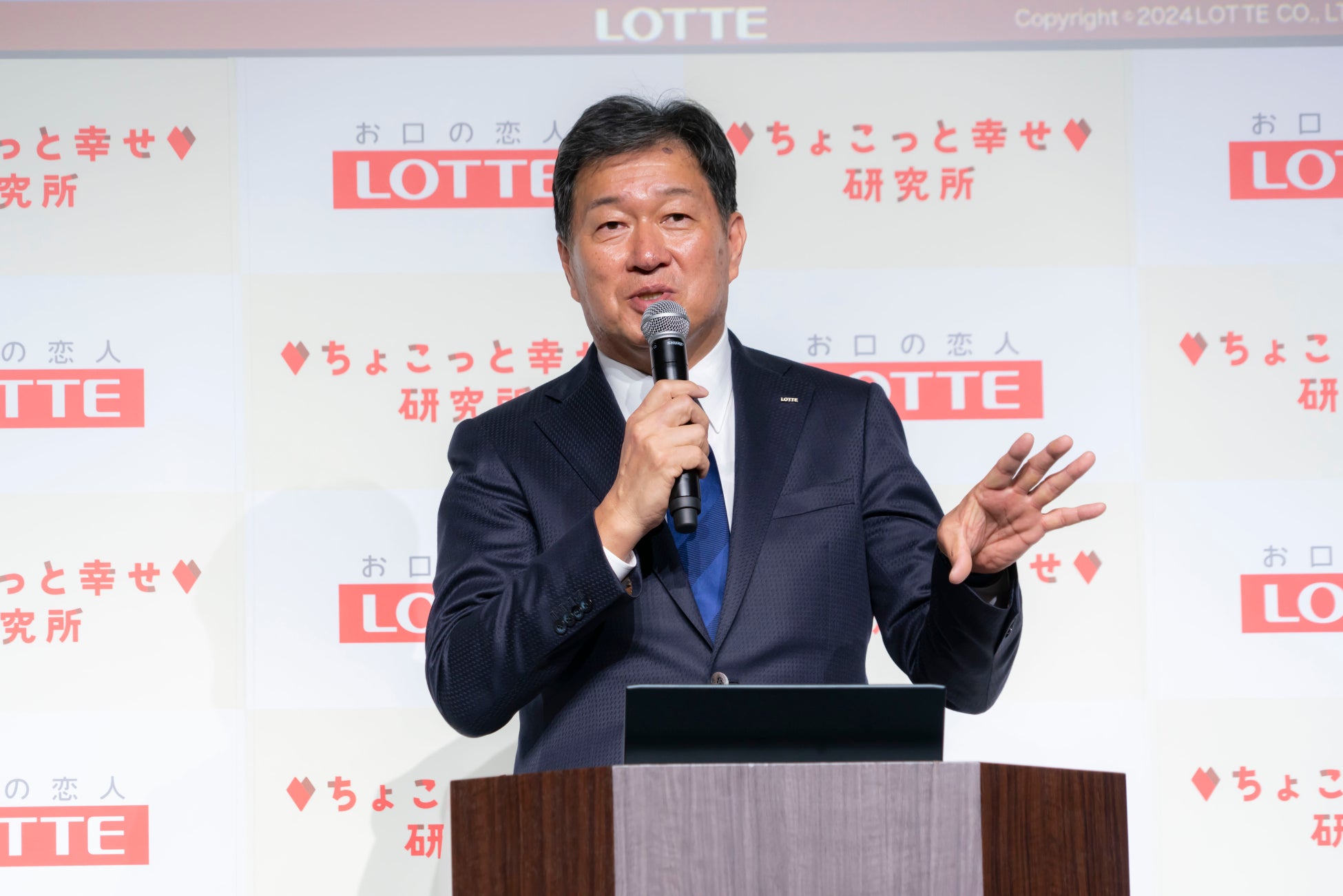 ロッテ取締役社長執行役員 牛膓栄一も登壇。 60周年を迎えるチョコレート事業の柱の1つに「心の健康」。社会貢献を目指す。