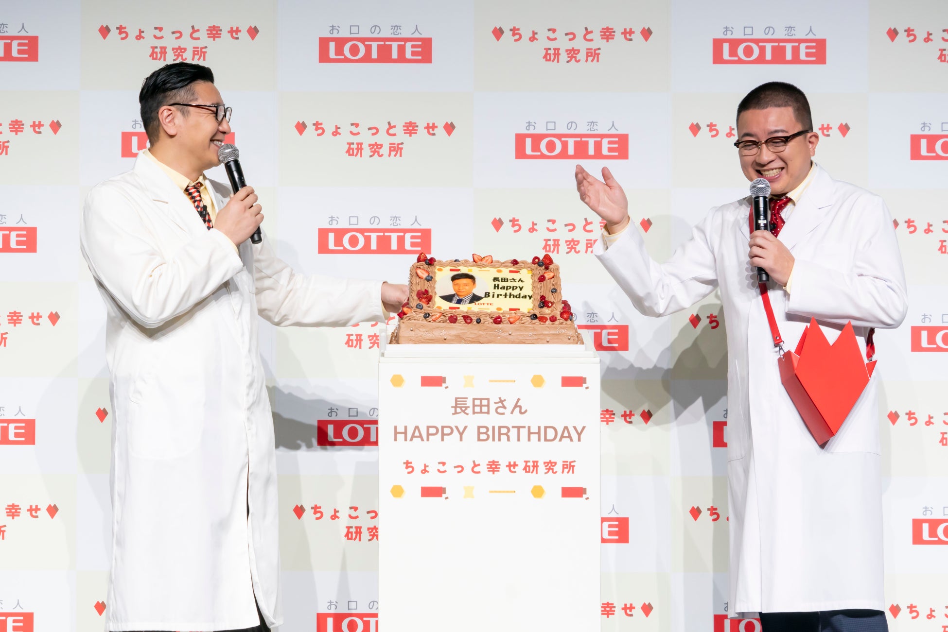 発表会の1部にはチョコレートプラネットのお二人が研究員姿で登壇。松尾さんはチョコレートが入ったポシェットを身に付け、会場の皆様へもチョコレートと一緒に「ちょこっと」幸せを配りました。また、「ちょこっと幸せ研究所」にちなみ幸せを感じる瞬間や幸せに生きるコツに関するトークを展開。一般の方から受け付けた人間関係や仕事のお悩みに、研究員らしく解決する「お悩み相談会」も開催しました。さらに、松尾さんから1月28日(日)に44歳を迎える長田さんへ「誕生日サプライズ」のお祝いケーキもプレゼントしました。