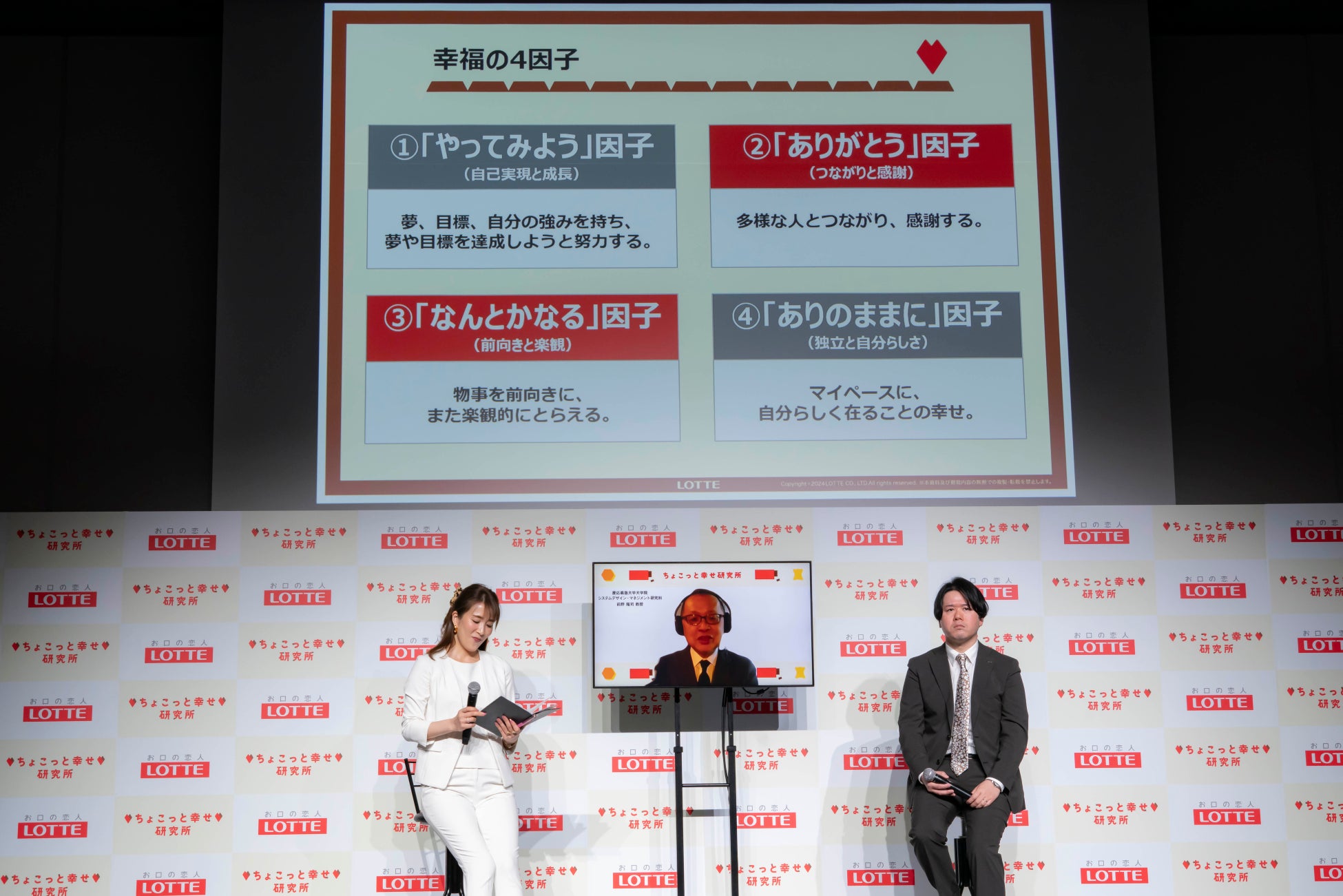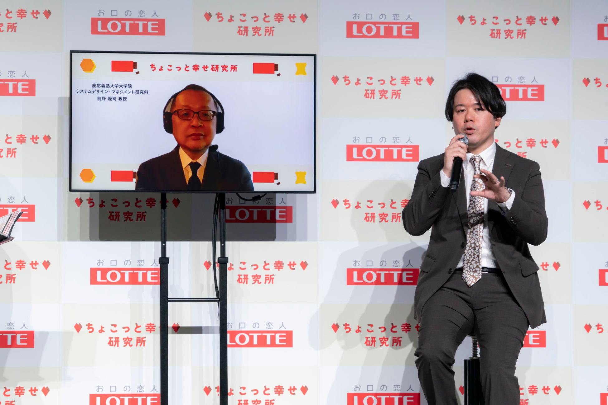 第2部では、ロッテ代表取締役社長執行役員 牛膓栄一より、60 周年を迎えるロッテチョコレート事業の事業戦略や今後の展望について発表しました。また、ちょこっと幸せ研究所責任者の中村準より研究所概要や研究内容を説明。その後、今回発表した「チョコレートの喫食と幸福度に関する調査」について、幸福学の専門家である慶應義塾大学大学院システムデザイン・マネジメント研究科 前野隆司教授とトークセッションを行いました。