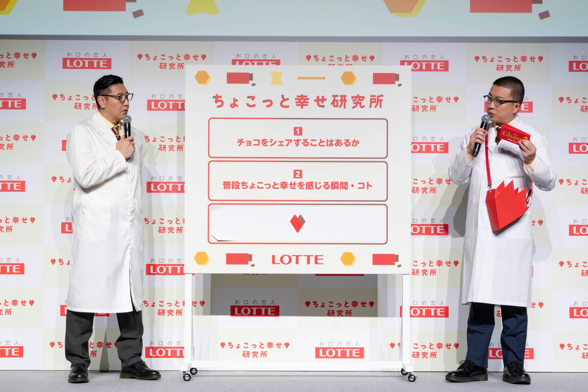 第1部はチョコレートプラネットさんが登壇!コンビ名の由来はロッテの「チョコレート」!? “ちょこっと”連発で会場を沸かす!第2部はチョコレート事業の新戦略、チョコレートと幸福度の関係性調査の結果を発表