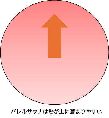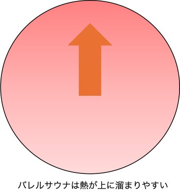 バレルサウナは丸い形状のため、熱が上部に溜まってしまい、室内温度が上がりにくい。