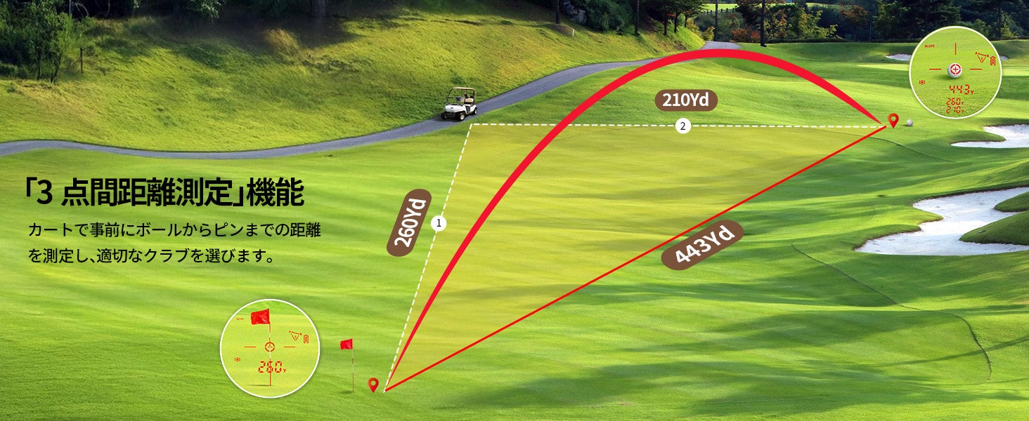 従来モデルB1000/B1000PROに加え、B1000F/B1000PROFには新たに「3点間距離測定モード」を搭載します。任意の2点間の距離が測れるため、クラブ選びの精度向上や、観戦中にゴルフプレイとターゲット間の距離を把握することも可能です。