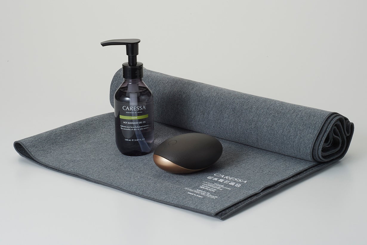 「ご褒美ホットスパセット」は、仕事や家事で毎日忙しい方でも手軽にスイッチ1つで本格ホットストーンマッサージをご自宅でお楽しみいただけるセットです。どなたでも簡単に、そしてより本格的なホームスパ体験ができるように、3つの専用アイテムをセットにしました。
