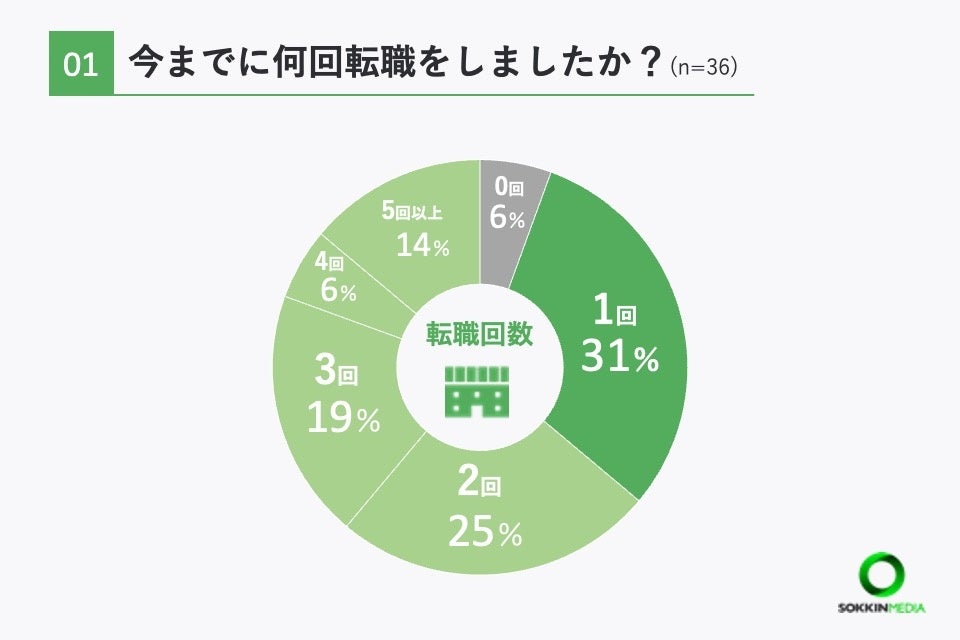 「Q1.今までに何回転職をしましたか?」という問いに対して、「1回」と答えた人が最も多く31%に上りました。さらに、1回以上転職したことがある人の割合は全体の9割以上を占めることがわかりました。