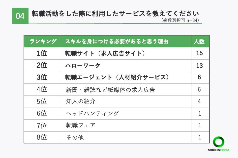「Q4.転職活動をした際に利用したサービスを教えてください。(複数選択可)」という問いに対して、「転職サイト(求人広告サイト)」という声が最も多く挙がり、15票でした。次いで「ハローワーク」が13票、「転職エージェント(人材紹介サービス)」が6票となっています。