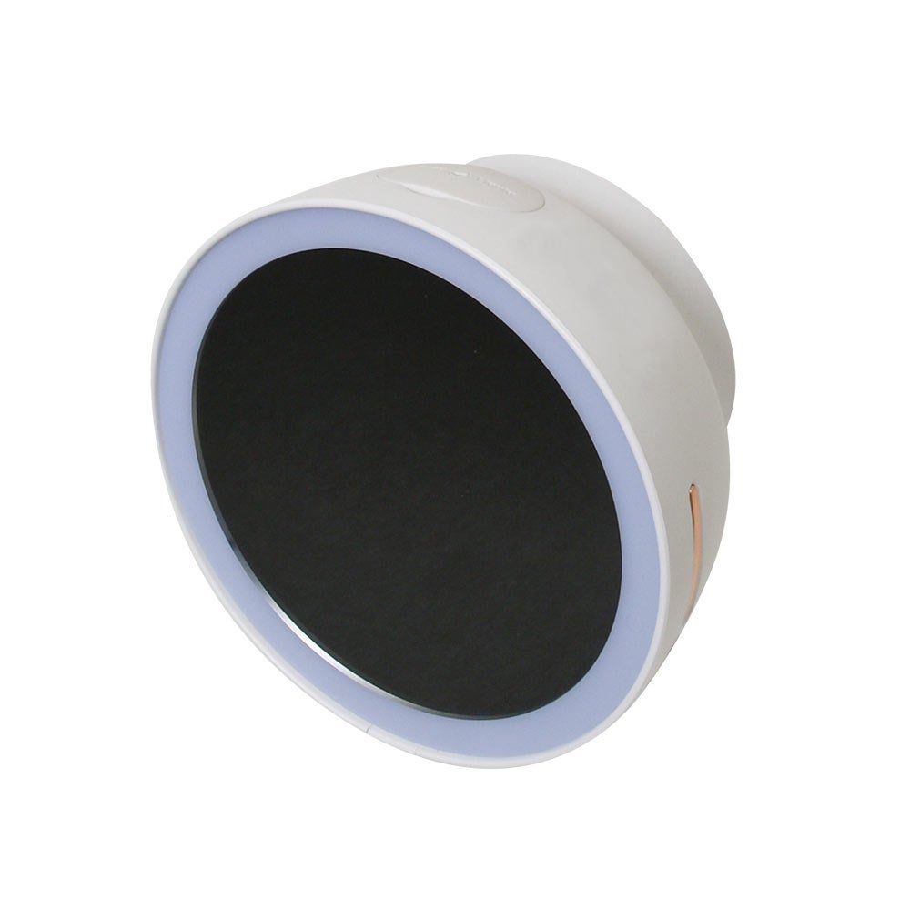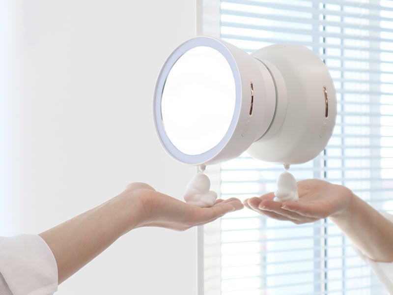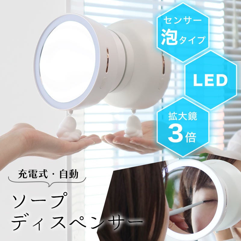 幅144×高さ148×奥行80mm。重量約370g。USB充電式。付属の粘着シートを化粧台の鏡などに張り付け本体を上からスライドして固定。本体上部のキャップを外し、お手持ちの液体せっけんを本体上部のキャップを開け補充。最大285mlまで入れられます。本体側面右側の電源ボタンを長押しすれば準備完了。手を本体の下にかざすと本体下部のノズルよりクリーミーな泡が出てきます。泡の出る量は電源ボタンを押して3段階(0.5秒、1秒、1.5秒)に切り替えが可能。LEDを搭載。本体表面はメイクなどに便利な3倍拡大鏡を採用。