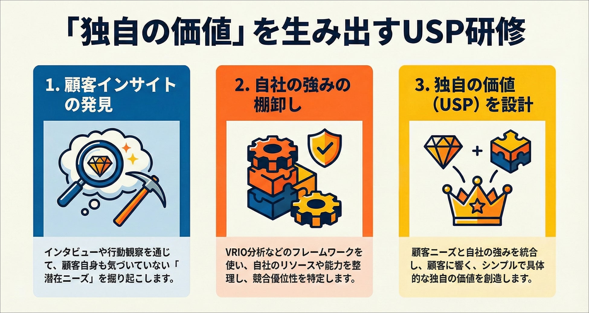 【リスキル】マーケティング戦略の核となる独自の価値提案(USP)を構築:若手・中堅・管理職向け「USP研修」で差別化を強化