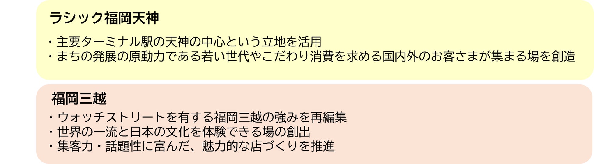 今まで岩田屋三越をご利用いただいているお客さまだけでなく、さらに天神というまちの発展の原動力である次世代のお客さまにもアプローチするため、上層階に専門店ゾーンラシックを拡大し「好きや興味関心の熱量と共感」から生まれるこだわり消費を狙ったコンテンツを提供してまいります。また、下層階の福岡三越ではウォッチストリートをはじめとする専門性の高いコンテンツを引き続き提供し、将来的には館全体の回遊性を高めたハイブリッド型のモデルを目指します。