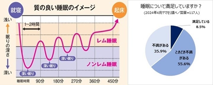 睡眠が十分な状態とは、『レム睡眠とノンレム睡眠の「睡眠サイクル」のバランスが良い状態』を指します(図①)。しかしながら現代人にとって睡眠は大きな課題となっており、睡眠に悩みを感じていると答えた人が約92%におよんでいるのが実態です(図➁)。睡眠が十分でないと日中の活動時間帯の生産効率が低下します。これらのことから、質の良い睡眠が健康的な社会生活を送るために不可欠であるにもかかわらず、昨今の環境下では満たされていない状態であることがわかります。