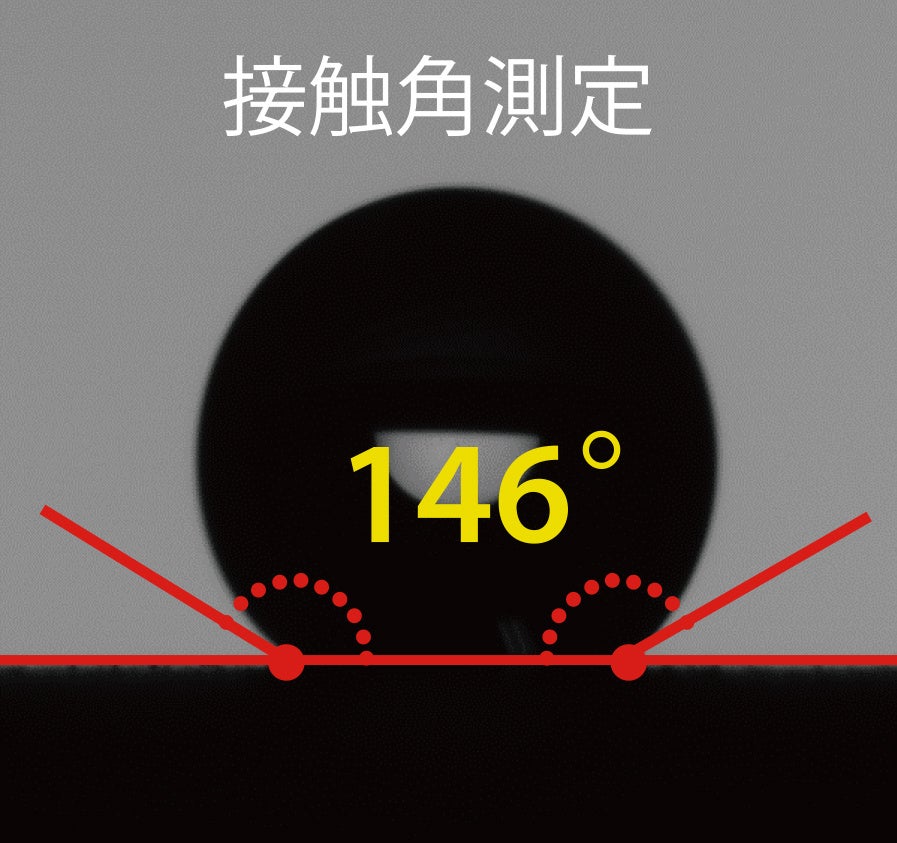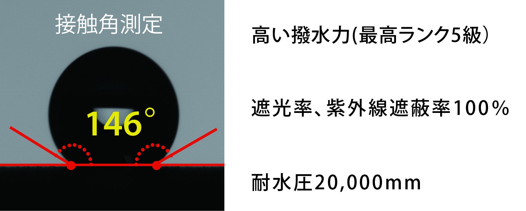 撥水性能最高ランク5級。水滴が面に対して約146°の接触角で転がり落ち、雨をしっかり弾きます。さらに、耐水圧20,000mmのポリウレタン加工で雨水の染み込みを防止。