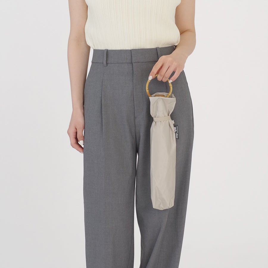 そこで「Peach drop SUN SHADE」の2段折りたたみ傘は、閉じた後にそのままベルトで留めれば長傘のように持ち運べる仕様に。もちろん、小さく折りたたんでケースに収納することも可能です。