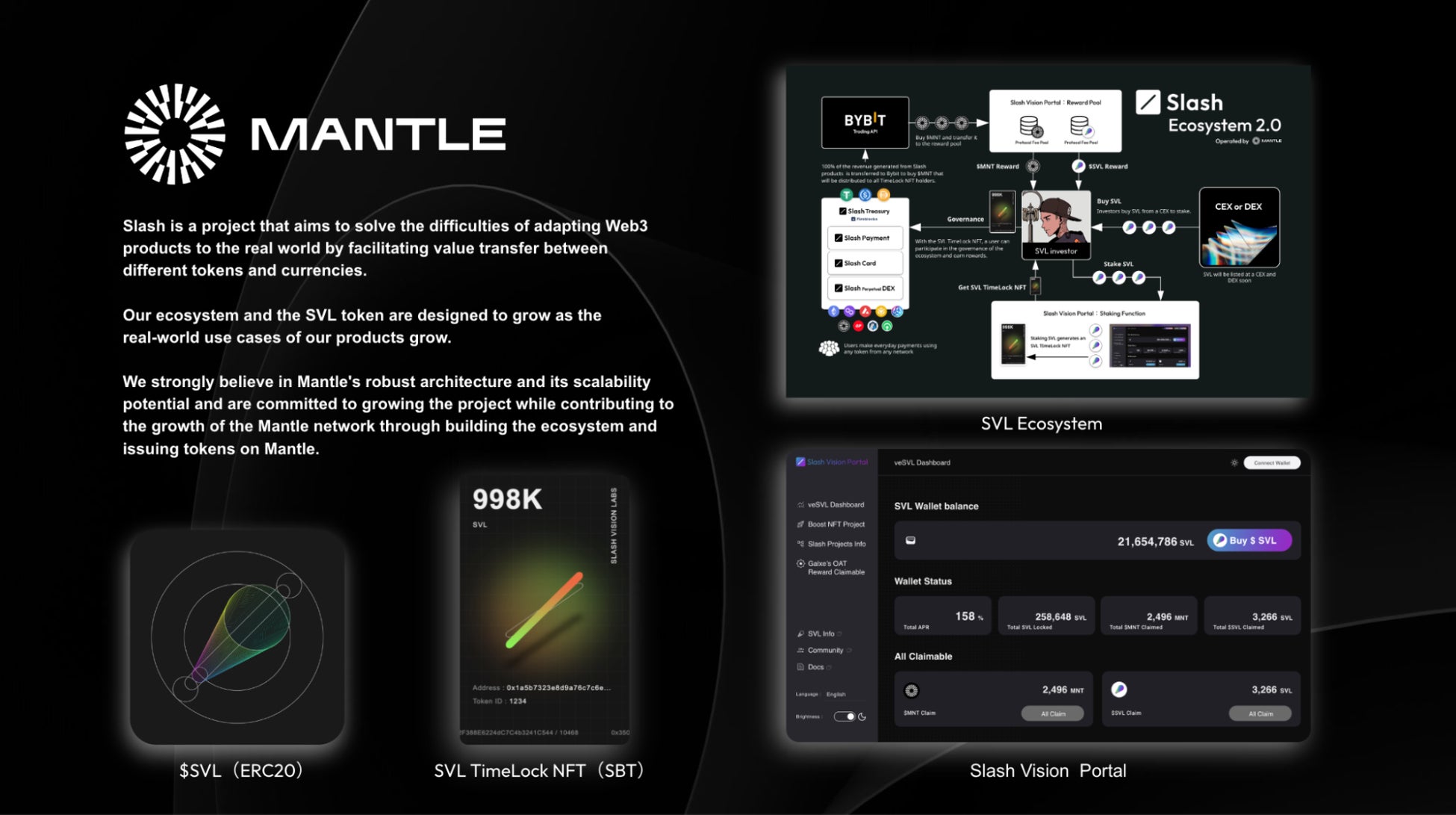 Slash Vision Labs Token(SVL)は2024年、CEXでのリスティングを予定しており、これによりWeb3市場での認知拡大やSlash PaymentのGMVの向上、そのプロトコルFeeによりMNTの買い上げが加速し、Slash Vision LabsプロジェクトにおけるSVL TimeLock NFTホルダーの利益拡大と、それに紐づくエコシステムの拡大が期待されます。