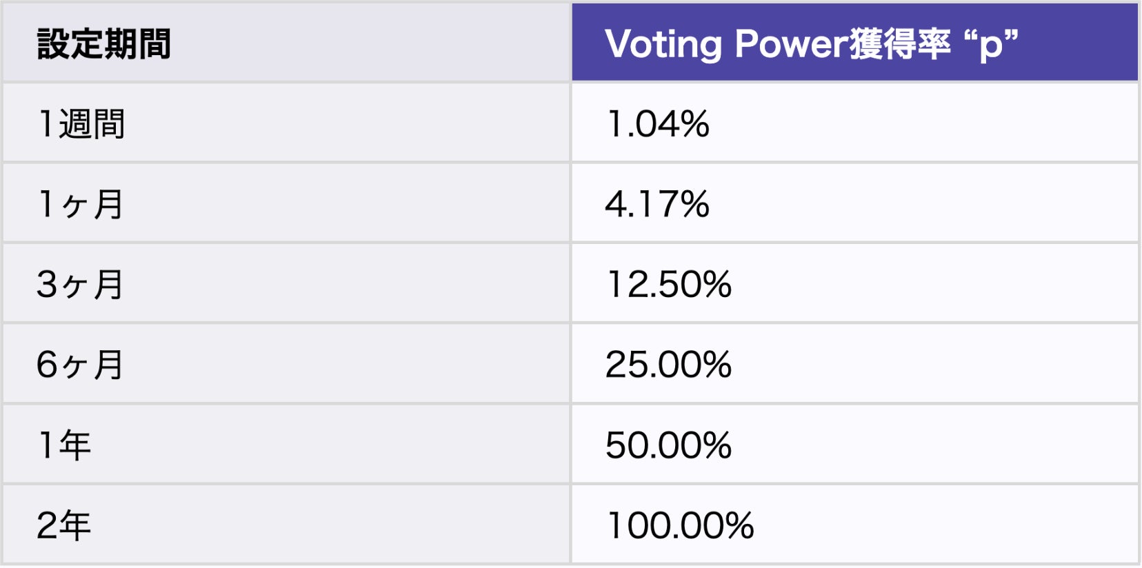 獲得可能なSVL TimeLock NFT がもつ Voting Power の大きさは、ステーキングする期間とステーキングするSVLの量と連動しており、ステーキング期間が長いほど獲得できるVoting Powerも多くなります。ステーキング期間は1週間から2年間まで選択できます。ステーキング期間の延長はいつでも可能です。Voting Powerの獲得率 p はステーキングする期間 t (期日までの残り時間)とステーキングの最大期間の2年間 tmaxの割合で算出されます。ステーキング期間を指定し、SVLをステーキングした時点で、設定期間分のVoting Powerを表すSVL TimeLock NFTが獲得できます。