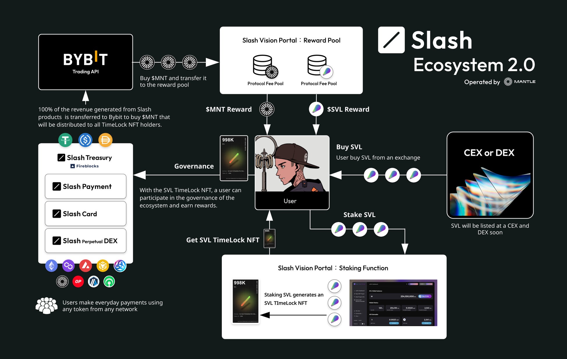 Slash Projectの中心にはSlash Vision Labs Token(SVL)が存在します。SVLをステーキングしたユーザーはその証明としてSVL TimeLock NFTを保有します。SVLは、Slash PaymentやSlash Cardのトランザクションによって得られる利益でMantle NetworkのネイティブトークンであるMNTを市場から買い上げて、SVL TimeLock NFTホルダーに還元するエコシステムを有しています。