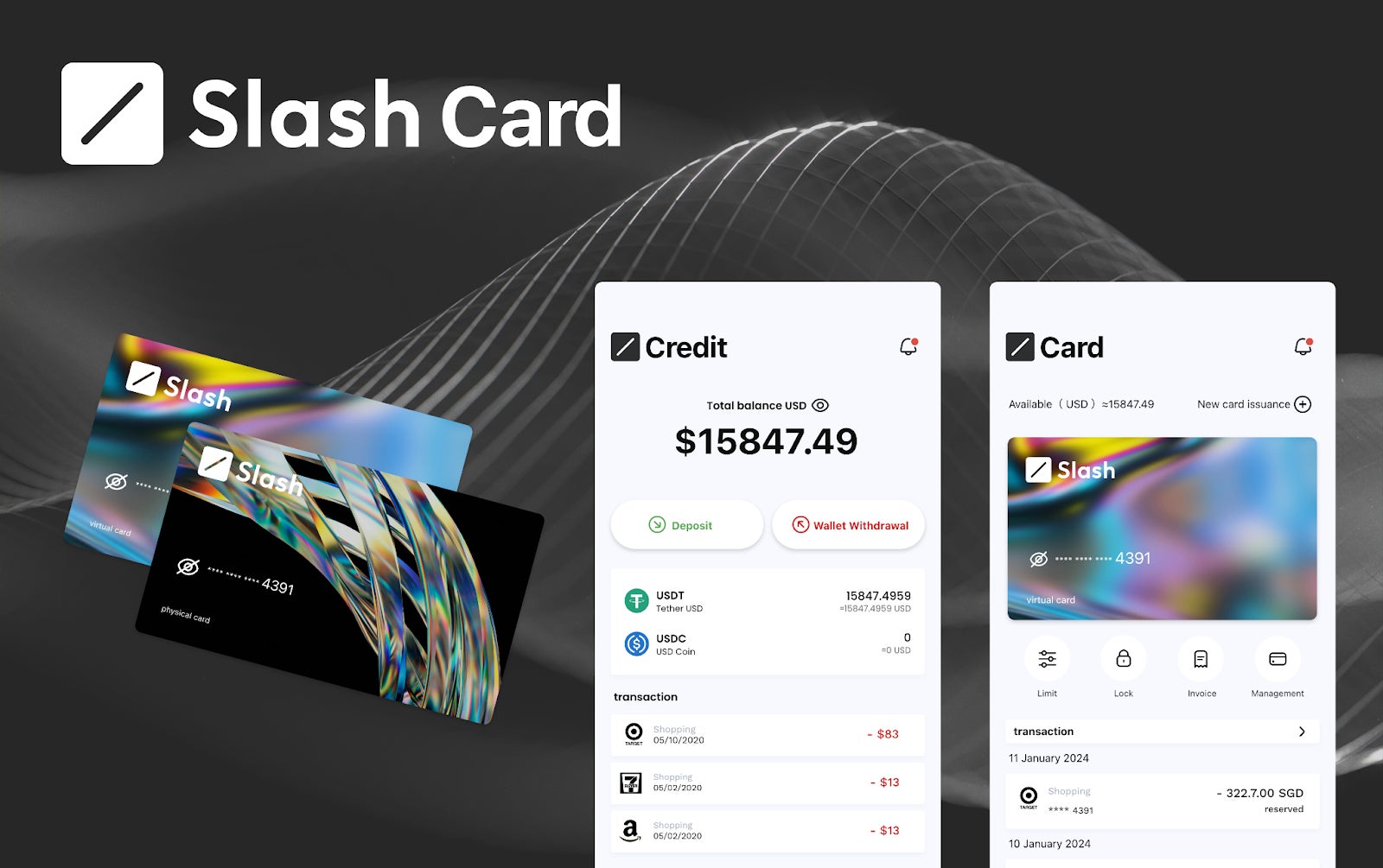 Slash Cardはセルフカストディウォレットを軸にコントラクトにUSDC、USDTなどの担保資金を保管する事でアプリ上で発行される国際ブランドのクレジットカードに与信を与える事ができる革新的なクレジットカードサービスです。
