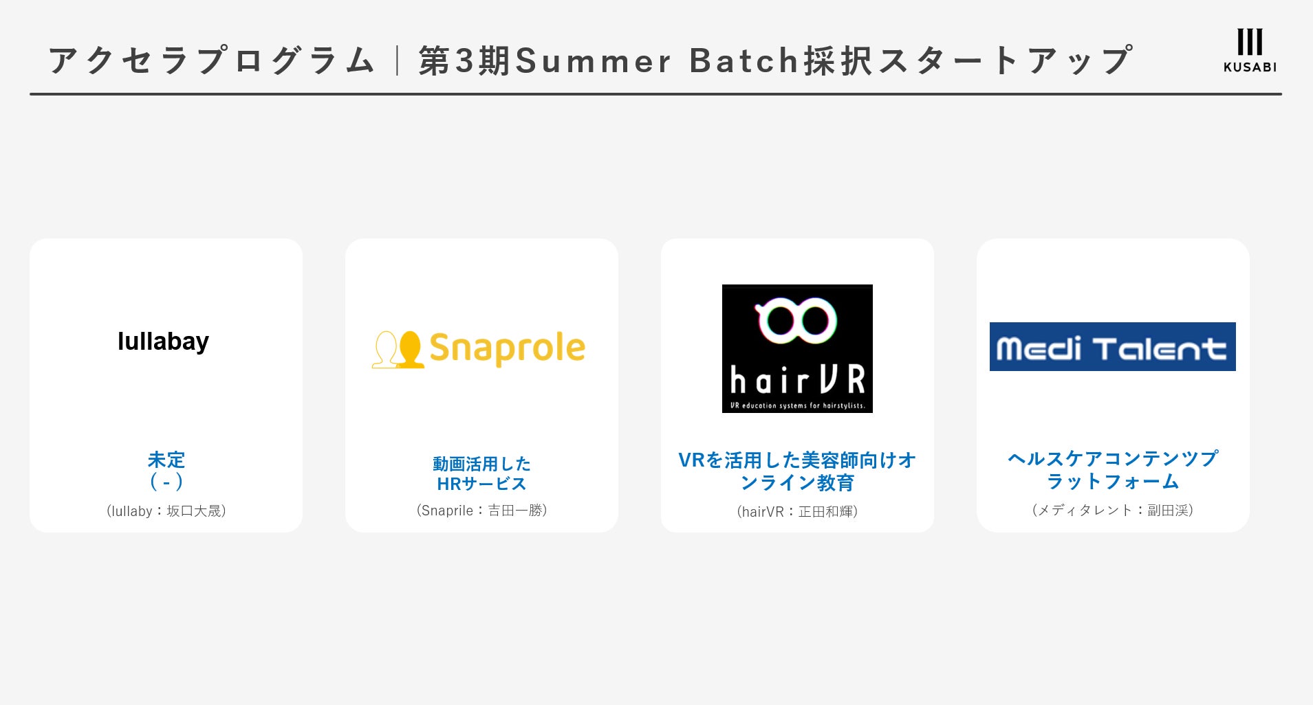 KUSABIは、創業前または創業間もないスタートアップ向けアクセラレーションプログラム「KUSABI α」において、第3期Summer Batchの採択企業を決定し、プログラムを始動しました。