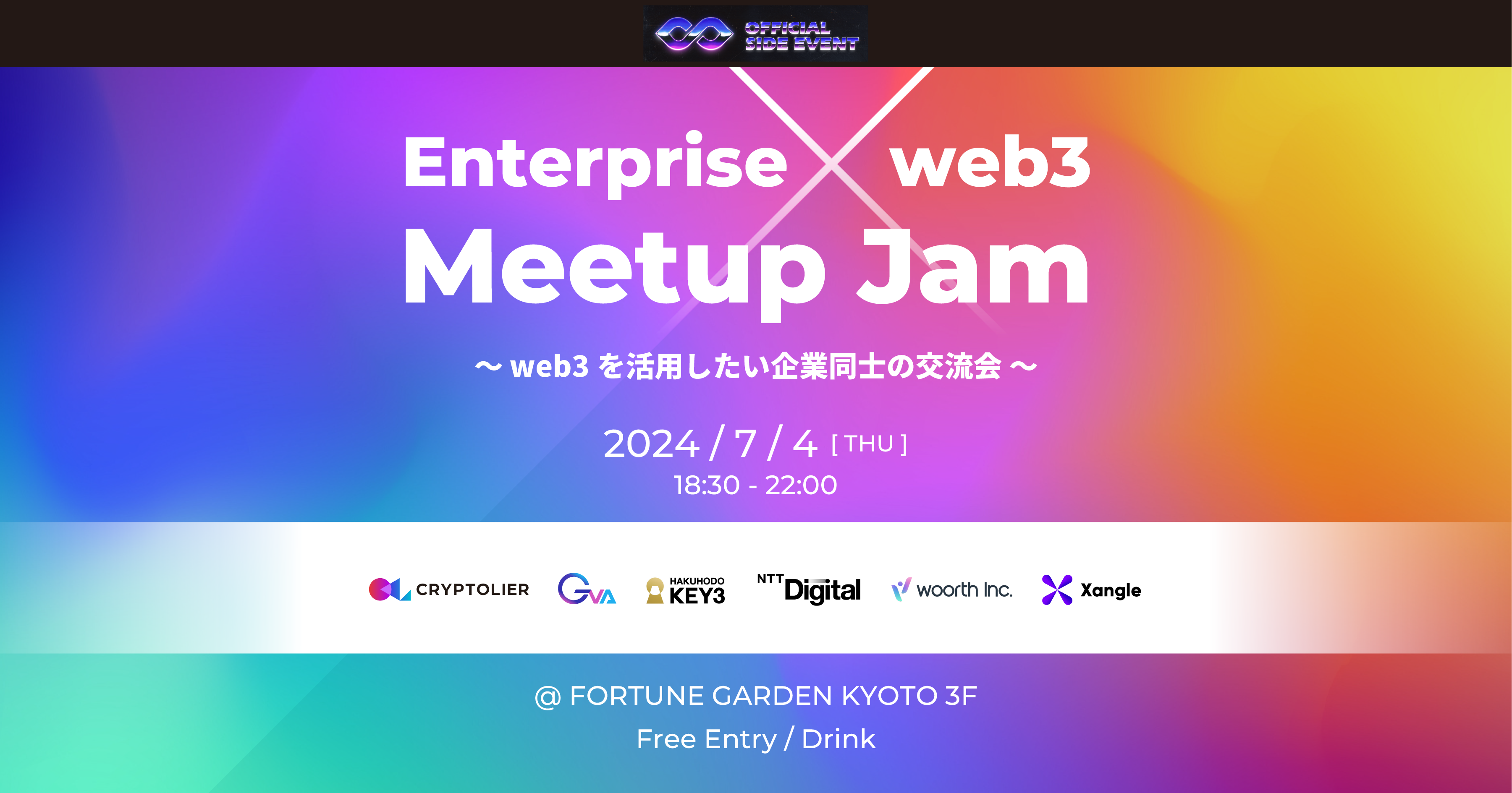 そこで、web3ビジネスに関心を持つ企業とweb3領域の専門家が集い、活発な情報交換を行うことを目的としたオフィシャルサイドイベント「Enterprise × web3 Meetup Jam 〜web3を活用したい企業同士の交流会〜」を企画しました。本イベントは、博報堂キースリー、NTT Digital、クリプトリエ、GVA法律事務所、Xangle、woorthの6社が共催し、web3の活用に関心のある企業の交流の場を提供します。IVS Crypto 2024 KYOTOという大規模なイベントの機会を活用し「Enterprise × web3 Meetup Jam」を通じて、web3のビジネスのさらなる発展を推進していきます。