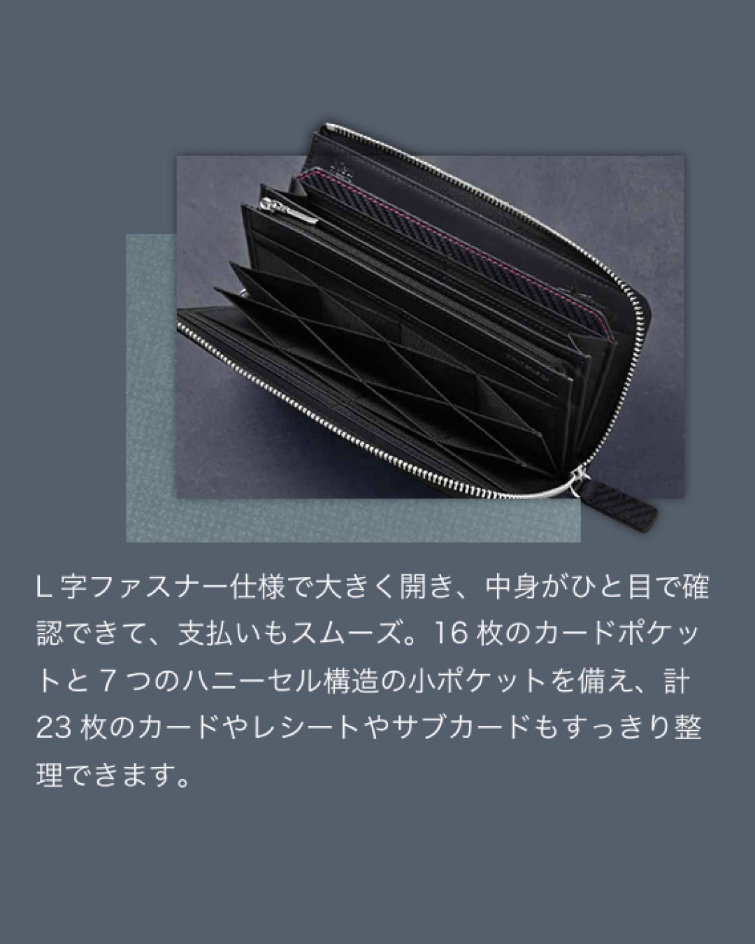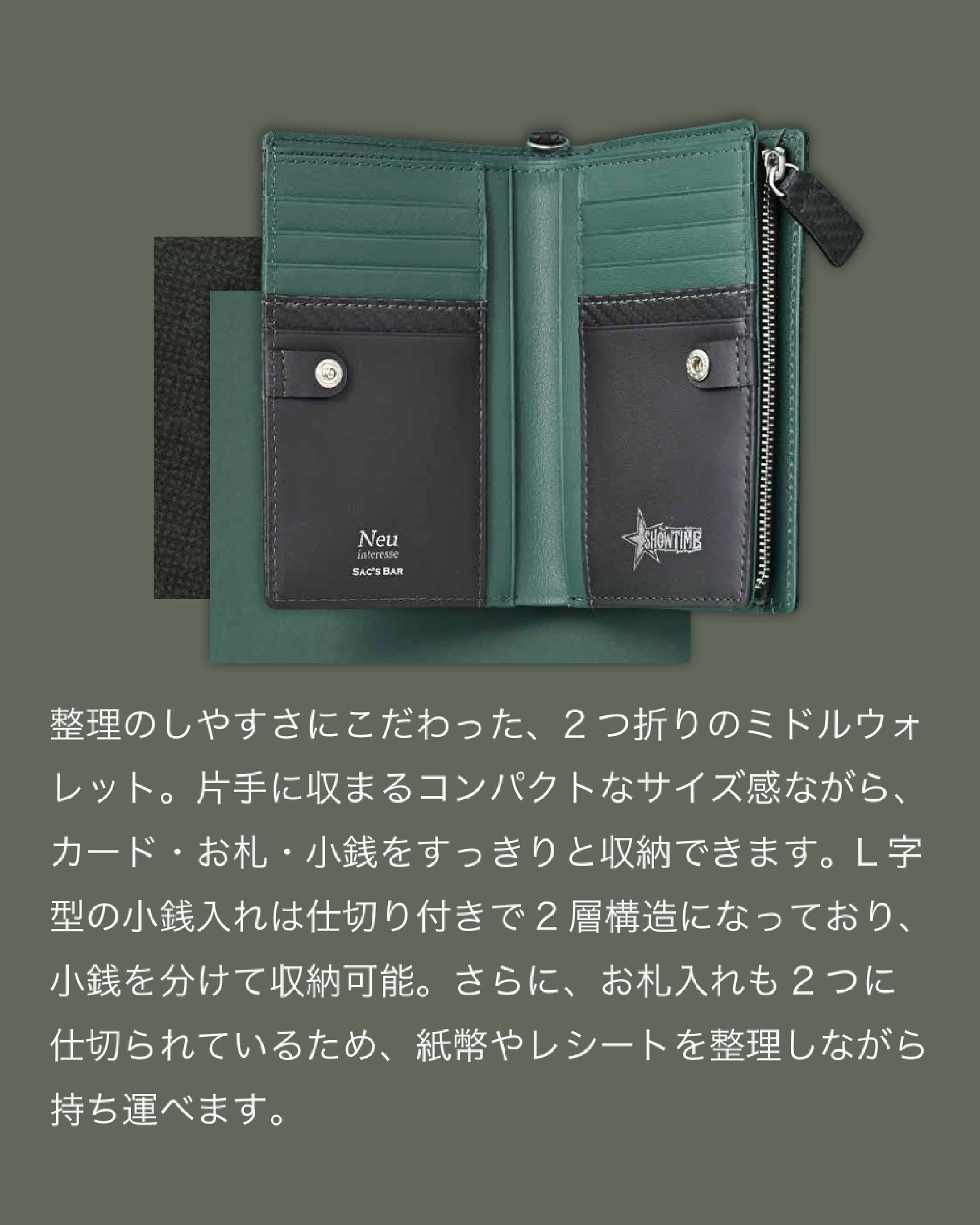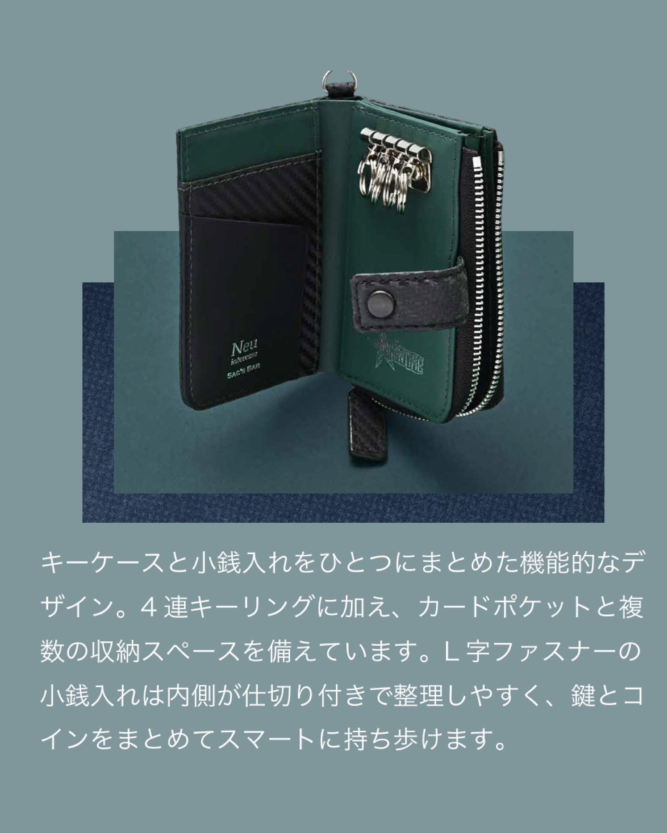 長財布はL字ファスナー仕様で大きく開き、中身をひと目で確認できる設計。ミドル財布や二つ折り財布はコンパクトながら整理しやすく、日常使いに適したサイズ感です。名刺入れは薄型ながらしっかり収納でき、スマートな印象を与えます。さらに、コンパクトウォレットやキーケースは携帯性にも優れ、日々の使いやすさを高めています。