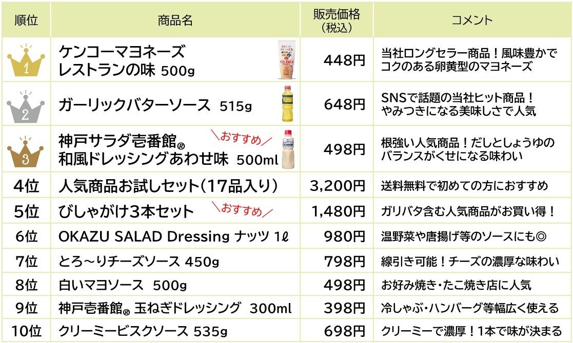 1位と2位は、当社代表商品がランクイン!3位の『神戸サラダ壱番館🄬 和風ドレッシングあわせ味』は、だしとしょうゆのバランスがくせになる味わいの商品で、当社のロングセラー商品の1つです。当社ならではの商品『OKAZU SALAD Dressing ナッツ』や『クリーミービスクソース』も多くのお客様にご購入いただきました。