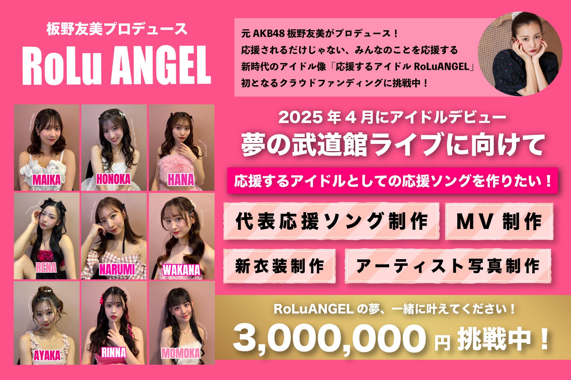 元AKB48、板野友美がプロデュースする9人組アイドルグループ「RoLuANGEL(ロールエンジェル)」は、グループ初となるクラウドファンディングを本日2025年6月25日(水)18:00よりスタートいたしました。