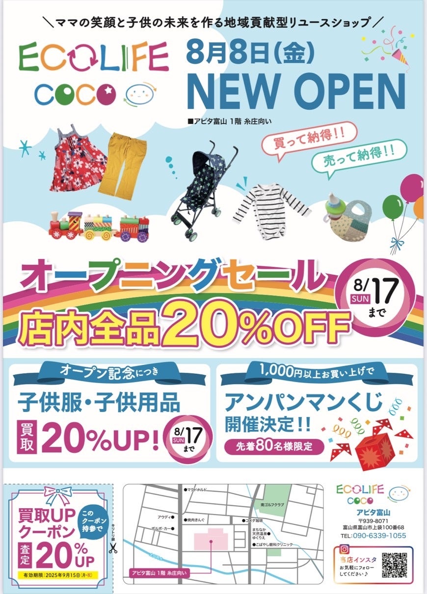 子供服リユースショップECOLIFE COCO(エコライフココ)「アピタ富山店」を2025年8月8日(金)にオープンすることが決定いたしました。オープニング記念として店内全商品20%OFF、買取査定額の20%UPを実施いたします。また、かわいいアンパンマンくじも開催。USヴィンテージキッズ古着も数量限定で販売予定です。お子様もママもおトクがいっぱいですのでぜひご来店ください。