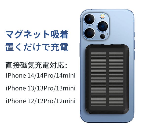 手のひらサイズに「マグネット充電」「急速充電規格に対応」「パススルー充電」などの機能を兼ね備えています。ケーブル不要で充電でき、持ち運びもしやすくて日常からアウトドアシーン、防災まで幅広く活躍します。
