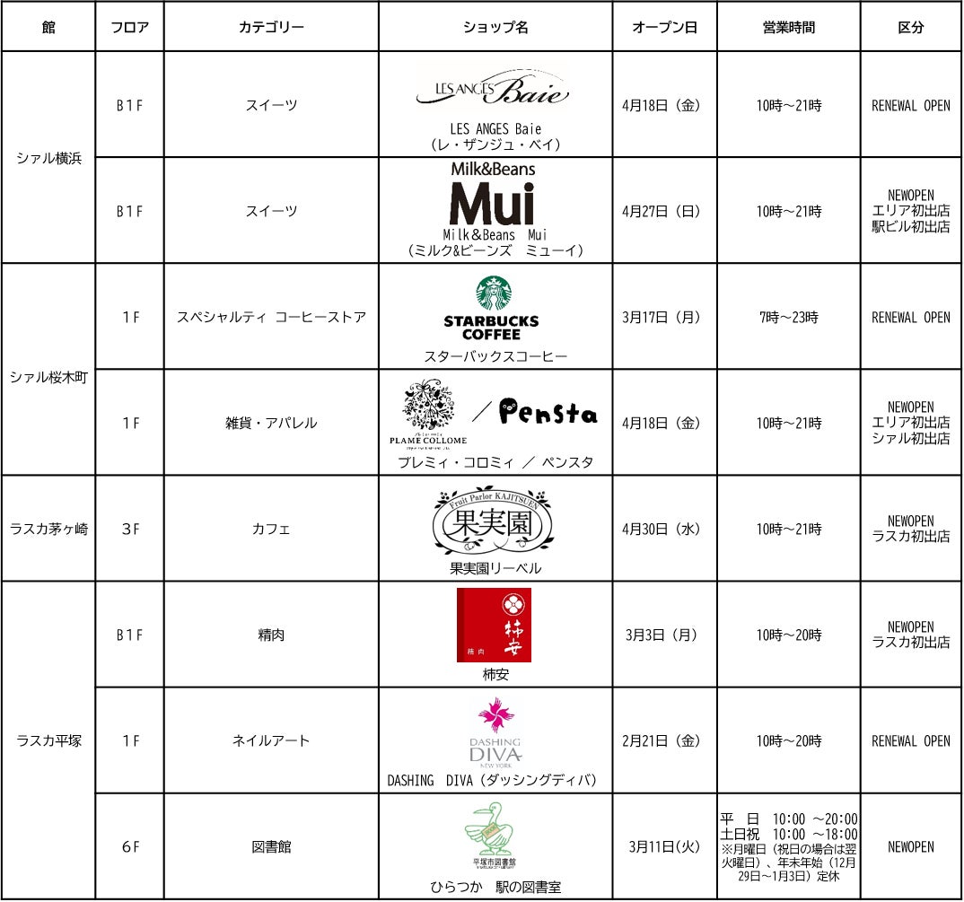 株式会社JR横浜湘南シティクリエイト(本社:神奈川県平塚市代官町/代表取締役社長:田村修)が運営するシァルおよびラスカ各館では、2025年3月にNEW OPEN &RENEWAL OPENしたショップを含め、4月までに合計8ショップがオープンします。