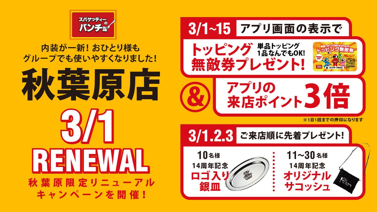 【3/1リニューアルOPEN】五感で楽しめるナポリタン専門店、秋葉原パンチョが新しい装いになって戻ってきた! 3/1~3/15にリニューアルキャンペーンを開催