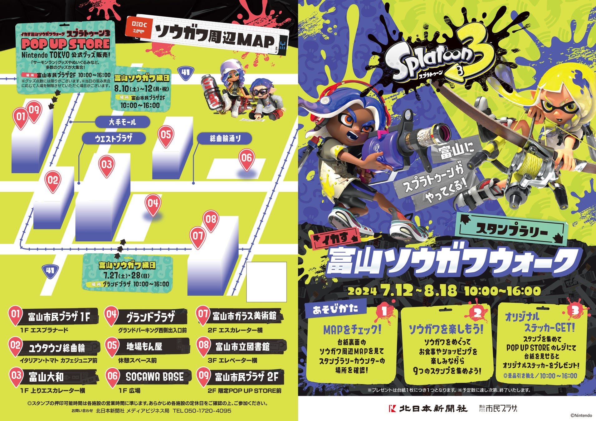 株式会社北日本新聞社では2024年7月12日(金)から8月18日(日)まで任天堂株式会社のNintendo Switch™用ゲームソフト『スプラトゥーン3』をテーマにしたイベント「スプラトゥーン3 イカす富山ソウガワウォーク」を開催いたします。 このイベントは『スプラトゥーン3』の様々な装飾がされている富山市中心部に設置された全9か所のスタンプを集める街歩き型イベントです。