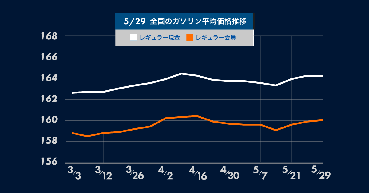5月29日(月) 時点のレギュラーガソリンの全国平均は、164.2円となり先週から0.6円の値上がり。2週連続の値上がりとなりました。