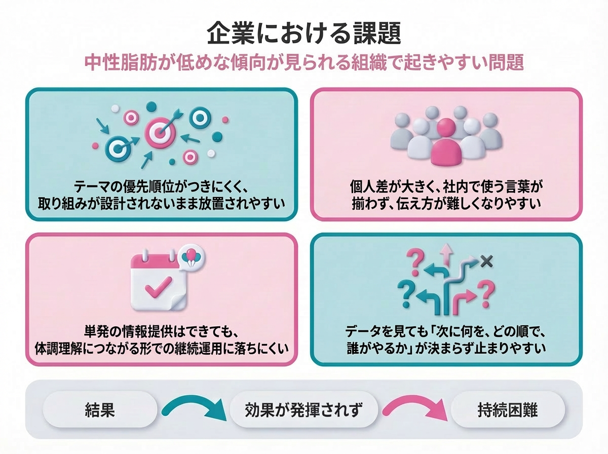 中性脂肪が低めな傾向を起点に、体調理解を深める情報設計と日常の工夫を職場でまわす進め方を専門職連携で整理
