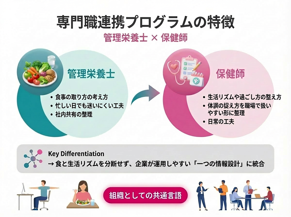 ・管理栄養士と保健師が連携し、体調理解を深める情報設計と日常の工夫を職場で扱いやすい形に整えます。