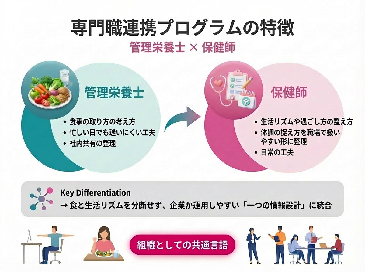 食と生活リズムを分断せず、企業が運用しやすい「一つの情報設計」として整える点が特徴です。
