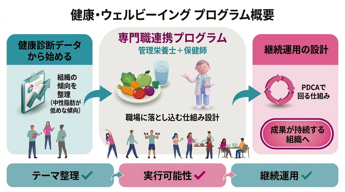 中性脂肪が低めな傾向は、派手な施策になりにくい一方で、情報の届け方と言葉の整備をすることで、職場として扱いやすくなるテーマです。大切なのは、健康診断データを起点に、扱うテーマと順番を整理し、管理栄養士と保健師の役割分担を揃え、体調理解を深める取り組みとして社内でまわる形に落とすことです。