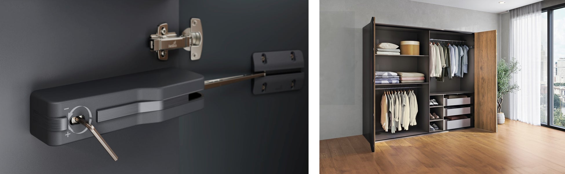 広々とした収納スペースの確保を実現するウィングラインシステムは、リビングスペース、ベッドルーム、キッチン、書斎などに最適です。 このシステムは、下ガイドが目立たないので、高品質な外観を実現します。 扉のデッドスペースを最小限に抑え、収納内に設えた引き出しや収納ボックスは、扉に干渉することなく楽々と中のものを出し入れできます。